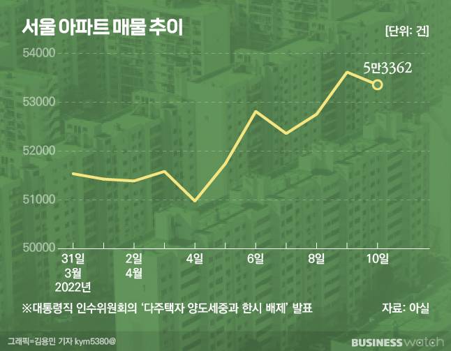 이미 인수위가 양도세 중과 한시 배제 방침을 발표한 후 매물이 늘고 있다. 부동산빅데이터업체 아실에 따르면 서울 아파트 매물(전·월세 제외)은 지난달 31일 5만1537건에서 이달 10일 5만3362건으로 열흘 만에 3.5% 늘어났다.