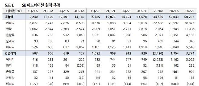 배터리사업도 1707억원의 적자를 예상했다. 그는 “배터리 사업은 차량용 반도체 수급 이슈, 공장 초기 가동 비용 반영 이슈가 지속되며 적자가 예상된다”며 “분리막 소재도 유럽 공장 가동률 50%에 머물며 적자 소폭 축소에 그칠 전망”이라고 내다봤다.