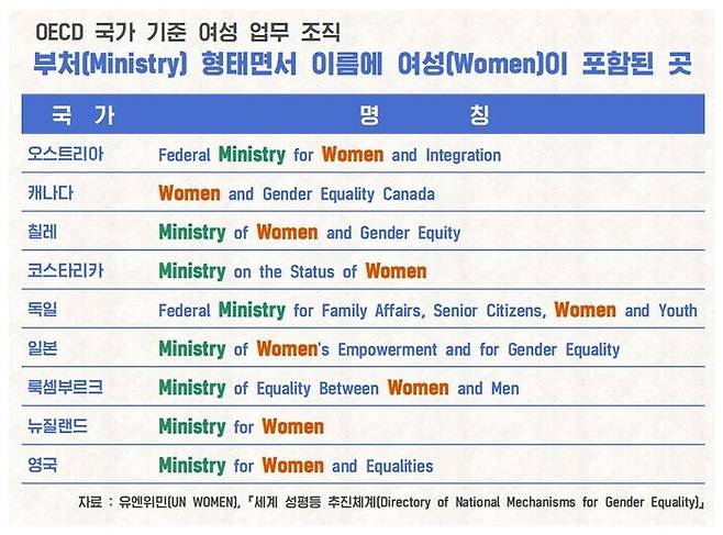 여성 부처를 만들고, 여성 명칭을 붙인 사례는 여성의 지위가 낮은 국가들이 많다. 우리나라가 80년대에 여성 인권이 열악해 여성부가 필요하다는 말이 나왔었는데, 그 당시 우리 수준처럼 여성 인권이 열악한 국가들이 여성 인권 개선을 위해 '여성'이라는 이름을 붙인 부처를 만들고 있다. 그런 국가들과 우리를 동등비교할 수는 없다. OECD 국가들을 기준으로 비교해야 한다.