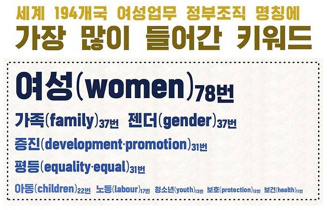 현재 대통령인수위가 여가부 폐지를 기조로 업무 이관을 검토하고 있는 만큼, 해외 사례는 좋은 참고사항이 됩니다. 194개 국가 '모두'를 대상으로 했습니다.