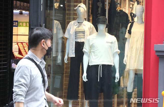 [서울=뉴시스] 전진환 기자 = 서울 낮 한때 기온이 25도를 기록하는 등 초여름 날씨를 보인 12일 오후 서울 중구 명동 상점 쇼윈도에 여름 옷이 전시돼 있다. 2022.04.12. amin2@newsis.com