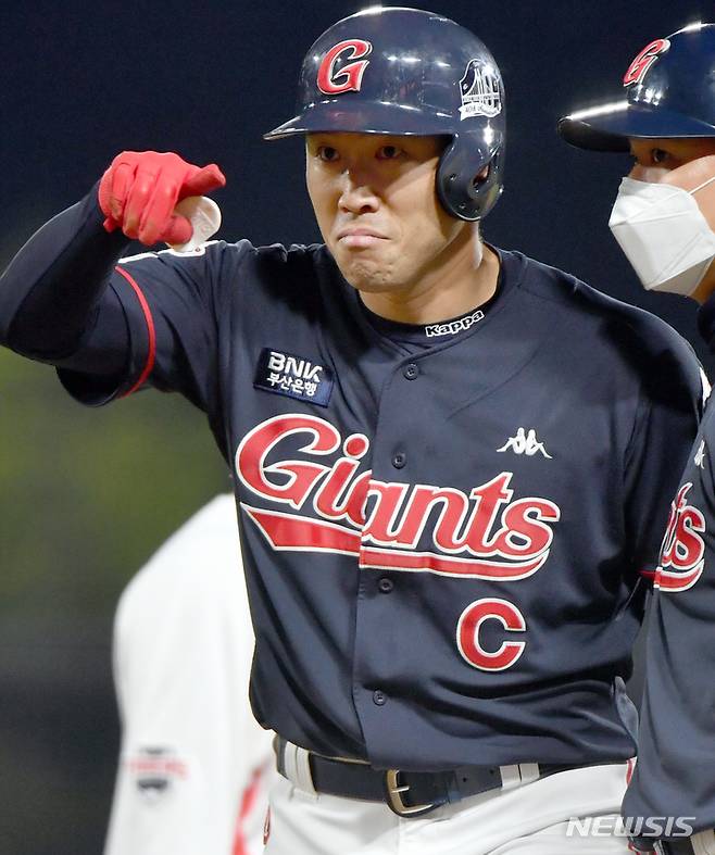 [광주=뉴시스] 류형근 기자 = 12일 오후 광주 북구 광주-기아챔피언스필드에서 열린 2022프로야구 KIA 타이거즈 대 롯데 자이언츠의 경기, 7회초 2사에서 롯데 4번타자 전준우가 안타를 친 뒤 세리머니 하고 있다. 2022.04.12. hgryu77@newsis.com