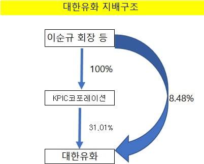 불투명한 지배구조도 기업가치를 갉아먹는 배경이다. 이순규 회장의 개인회사인 케이피아이씨코포레이션(이하 KPIC)은 매년 대한유화와의 내부거래를 이어가면서 사세를 키워가고 있다. KPIC는 대한유화에 운송 서비스 등을 제공하고 지난해 180억원의 매출을 올렸다. 이어 작년에 대한유화가 생산한 1조3113억원어치 화학제품 판매를 대행해 중개수익도 올렸다. 통상 화학업체들이 직접 또는 무역상사를 끼고 제품을 판매한다. 대한유화는 이 회장 개인회사인 KPIC를 유통 판로 중간에 끼워 일감을 제공하고 있다.