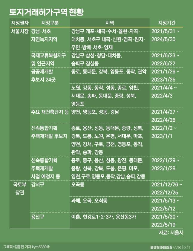 지난해 4월 오세훈 서울시장 당선 이후 대표적인 주택공급 정책인 '신속통합기획' 후보지인 종로, 용산, 성동, 동대문 등도 허가구역으로 지정했습니다. 이 밖에 △강남구의 개포·세곡·수서·대치동, 서초구 내곡·서초·양재 등 강남·서초 자연녹지지역 △강남구 삼성·청담·대치동, 송파구 잠실동 등 국제교류복합지구 및 인근지역 △양천, 영등포, 성동, 강남 등 주요 재건축단지 등도 지정돼 있고요.