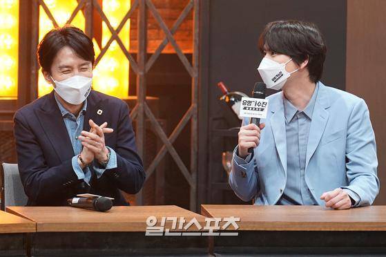 가수 규현, 유희열이 15일 오후 온라인 생중계로 진행된 JTBC 예능 프로그램 ‘유명가수전-배틀어게인’ 제작보고회에 참석해 소감을 말하고 있다.