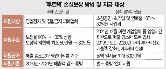 윤석열 대통령 당선인의 공약 이행을 위한 중소벤처기업부 손실보상의 핵심은 법률(영업제한·집합금지)에 따라 손실을 본 소상공인 80만 명에 대한 지원과 영업제한·집합금지를 적용받지 않았어도 피해가 발생한 소상공인은 물론 소기업과 연 매출 10억 원 초과, 30억 원 이하 사업체에도 방역지원금을 지급해 최대 340만 명에게 보상할 수 있는 일종의 ‘투트랙’ 방식이다.