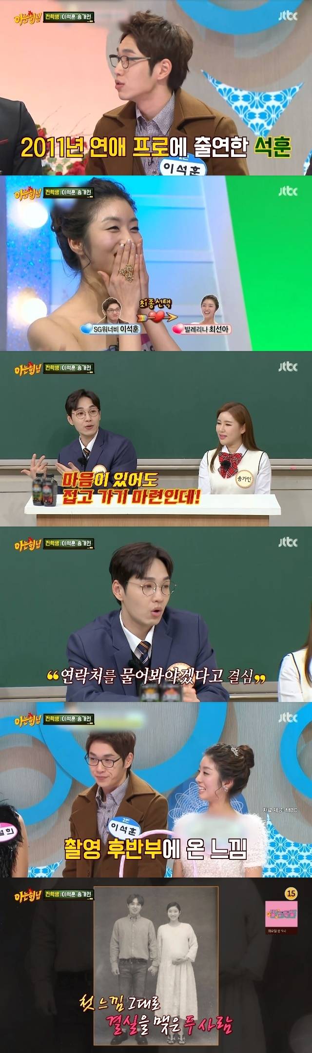 강호동은 이런 이석훈이 아내를 연애 프로그램에서 만난 사실을 대신 전했다. 이에 이석훈은 한창 연애 프로그램 섭외를 많이 받던 때 "고사하고 있었는데 이건 하게 됐다"면서 "갔는데 눈에 띄는 여성분이 있더라"고 밝혔다.