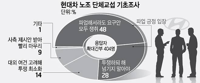 현대차 노조가 지난달 말 대의원 이상 확대 간부 404명을 대상으로 사측과 올해 단체협상 준비를 위한 설문조사를 한 결과 76%가 파업에 긍정 입장인 것으로 나타났다. 응답자 중 48%는 '투쟁을 해서라도 반드시 요구안을 모두 쟁취해야 한다', 28%는 '투쟁을 해야 하지만 해를 넘기지는 말자'고 했다.