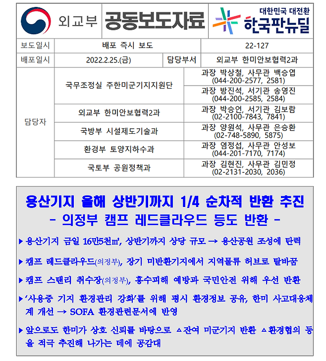 최근 보도자료를 보자. 지난 2월 정부는 합동 보도자료를 내고 용산기지 일부를 추가 반환받고, 의정부 캠프 레드클라우드 등을 반환 받았다고 발표했다.