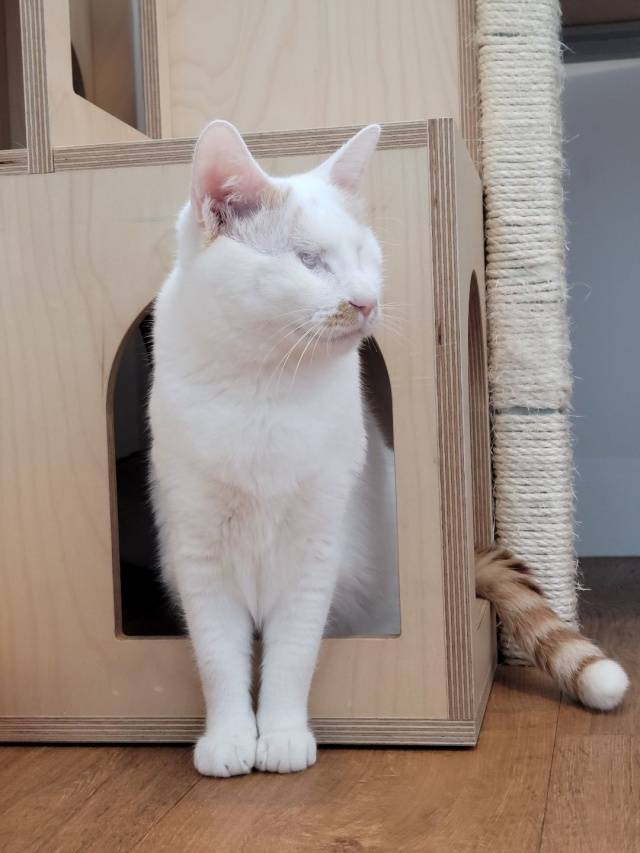 고양이는 수염을 통해 앞의 장애물을 파악하고 공간을 느끼는 등 앞이 보이지 않아도 감각을 통해 주변을 파악할 수 있습니다. 천천히 공간을 탐색하고 공간에 적응하는 시간이 조금 필요할 뿐입니다. 흰둥이와 피오나도 익숙하게 캣타워를 오르고 서로 잡기 놀이도 하며 활발한 생활을 이어가고 있습니다. 서로 투닥거리기도 하고, 캣타워 꼭대기에 올라 여유롭게 햇살을 즐기기도 하고요. 공간의 구성이 바뀌거나 처음 접하는 새로운 장난감이 생기더라도 흰둥이와 피오나는 조금의 탐색을 마치면 금세 새로운 것에 적응하곤 합니다.