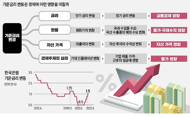 기준금리는 한은이 시중은행들과 만기 7일짜리 환매조건부채권(RP)을 매매할 때 기준으로 삼는 금리다. 한은 금융통화위원회가 이것을 조정함으로써 은행의 예금 금리와 대출 금리를 비롯한 시장 금리에 연쇄적으로 영향을 미치는 것이다. 대개 연 0.25%포인트씩 인상·인하하지만 한 번에 많이 건드리는 ‘빅스텝’을 취하기도 한다.