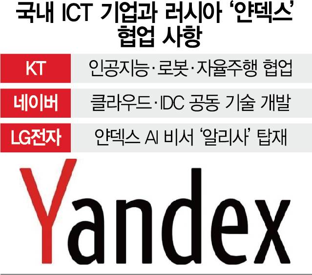 얀덱스와 협업에 나섰던 국내 ICT 기업들은 당황스러운 표정이다. 특히 올해들어 인공지능(AI)·로봇·자율주행 등 미래 신성장 사업 분야에서 얀덱스와 적극적인 협력에 나섰던 KT(030200)의 고심이 크다. KT는 올 초 얀덱스 자율주행 계열사인 얀덱스SDG와 사업협력을 시작했다. KT의 AI 기술력과 얀덱스 자율주행 로봇을 결합해 연내 자율주행로봇을 출시하겠다는 목표였다. 로봇 외에도 ICT 사업협력 TF를 운영한다는 계획도 내놨었다.