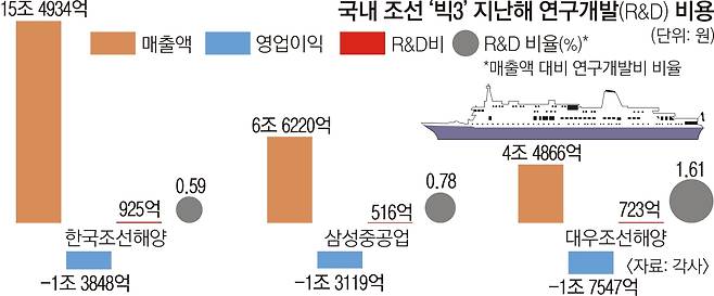 국내 조선 '빅3'가 지난해 영업적자 규모가 조(兆) 단위를 넘었지만 연구개발(R&D)비 투입을 강화한 것으로 나타났다.
