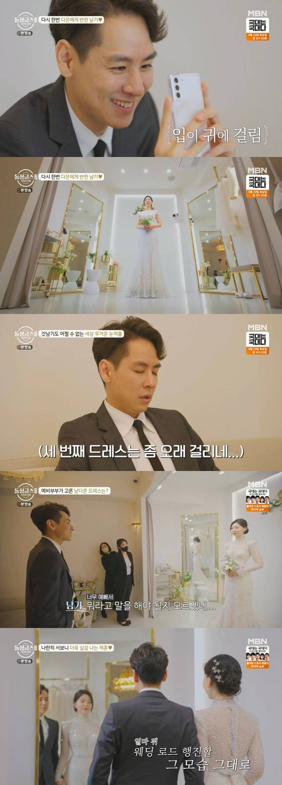 둘은 웨딩 드레스 고르기에 나섰다. 윤남기는 긴 환복 시간에 피곤해하면서도 커튼이 걷히자 '동공대지진'을 일으켰다. 그는 "너무 예쁘다", "뭐라고 말을 해야할 지 모르겠다", "아름다우시다", "여왕님 같기도 하고, 공주님 같기도 하고"라며 '리액션 장인'의 면모를 보였다. 윤남기는 "드레스는 화려해야 되는구나"라는 깨달음을 얻었고, 시스루로 된 웨딩 드레스를 최종적으로 선정했다.