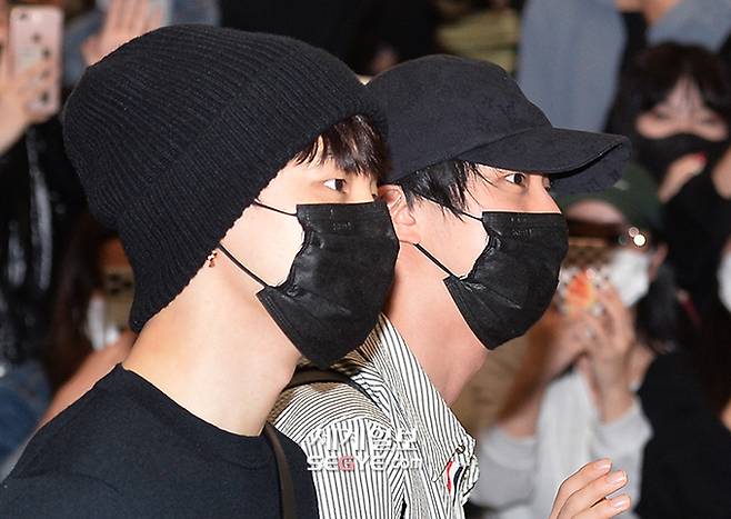 방탄소년단(BTS) 지민(사진 왼쪽)과 진이 19일 오전 인천 중구 운서동 인천국제공항 제 2여객터미널을 통해 미국 라스베이거스 얼리전트 스타디움(Allegiant Stadium)에서 열린 콘서트 일정을 마치고 귀국하고 있다.