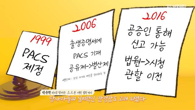 이후 2016년 개정에서는 PACS 신고의 담당이 법원에서 시청으로 이전됐고 공증인을 통해서도 신고가 가능해진다. 프랑스에서는 보통 시청이나 종교적 공간에서 결혼식을 올린다. 박준혁 파리1 팡테온 소르본대학 법학박사는 "법안의 개정 이후 PACS도, 심지어 동성애 PACS까지 시청에서 등록할 수 있게 되면서 당사자들의 심리적인 안정감도 고려된 것”이라고 설명했다. 이렇게 PACS라는 관계를 맺고 나면 국가에서 발급하는 증명서에 PACS 여부가 기록되고 파트너로서의 법적 권리와 의무를 지게 된다.