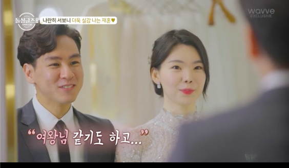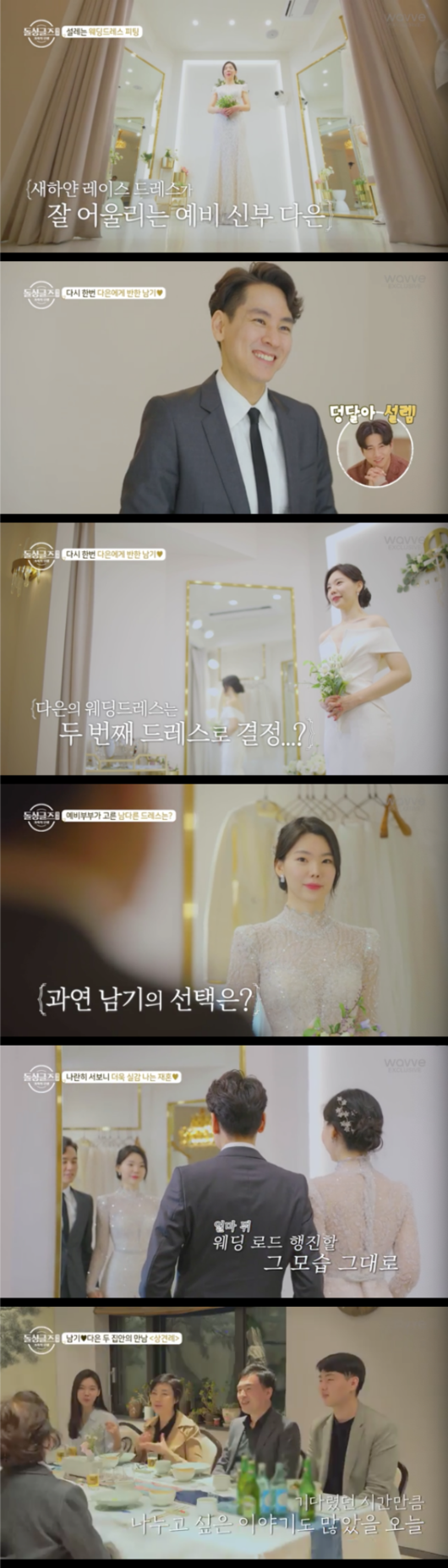 이다은은 드레스 가격에 대해 물었고 이에 윤남기는 "사려고? 매일 입을거야?"라고 농답했다. 두 사람은 나란히 서서 신혼부부 기분을 만끽했다. 윤남기는 "괜찮은데? 여왕님 같기도 하고 공주님 같기도 하다"며 웃음을 감추지 못했다.