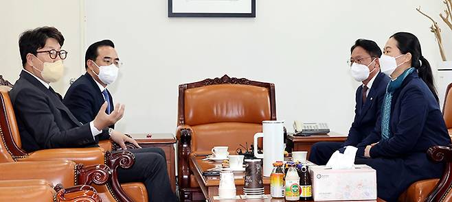 | 4당 원내대표 마주 앉았지만… 19일 국회에서 열린 ‘검수완박’(검찰 수사권 완전 박탈) 입법 관련 4당 원내대표 회동에서 참석자들이 발언을 하고 있다. 왼쪽부터 국민의힘 권성동 원내대표, 더불어민주당 박홍근 원내대표, 정의당 배진교 원내대표, 국민의당 권은희 원내대표. 허정호 선임기자 |