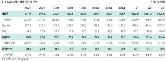 하나금융투자가 전망한 KG이니시스의 2022년 예상 매출액은 지난해보다 6.8% 증가한 1조1000억원, 영업이익은 8.6% 감소한 1034억원이다. 자회사 KG모빌리언스와 KG에듀원의 실적 둔화에도 글로벌, 중소형 및 호스팅 등 고수익 가맹점 위주의 거래액 성장과 온택트 가맹점 거래액 회복으로 외형 성장을 이끈다는 분석이다. 하나금융투자는 이 회사의 2022년 연간 거래액을 지난해보다 19.2% 증가한 32조9000억원으로 추정하며 본업인 결제 사업이 안정적인 성장세를 지속할 것으로 봤다.