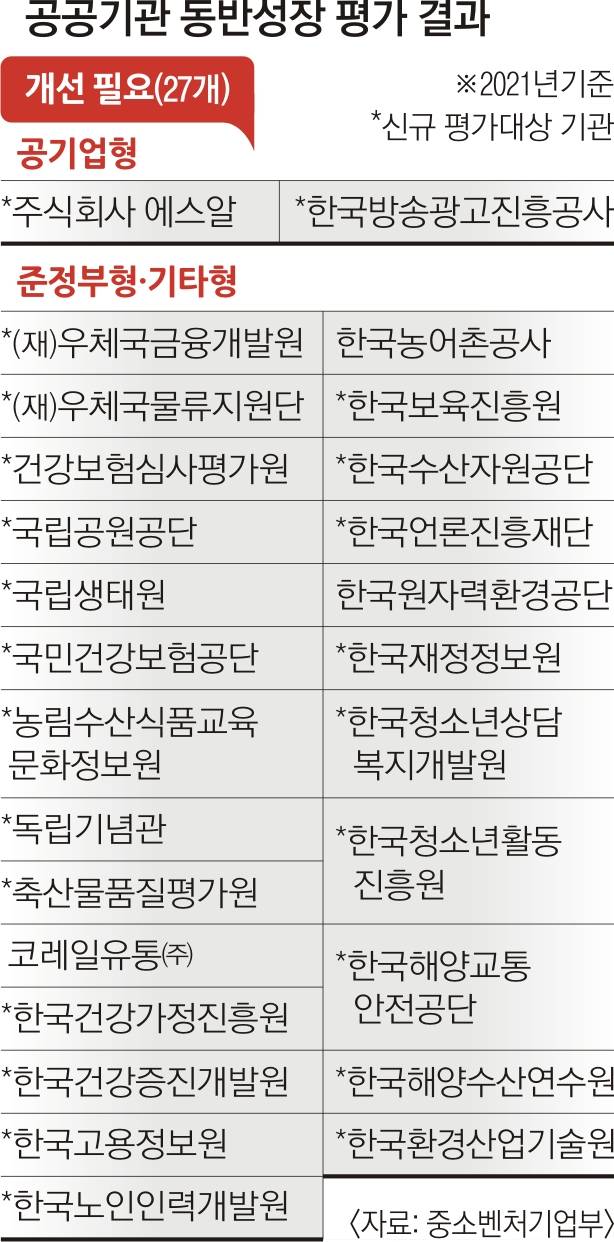 반면 건강보험공단 등 27개 공공기관은 동반성장 활동이 미흡해 개선이 필요하다는 평가를 받았다.