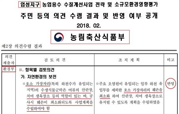 환경부는 '항목별 검토의견' 중 자연환경의 보전을 위해 "호소 가장자리(특히 하천수가 유입되는 지역)의 수생식물군락은 어류의 산란장, 치어 생육장소 등의 역할이 있는바, 공사 시 훼손이 최소화되도록 사업계획을 수립하여야 함"이라고 강조했다.
