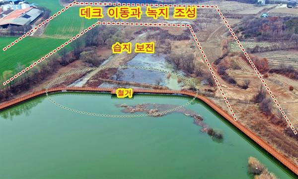 | ▲ 습지 중앙을 가로지르는 데크를 철거하여 습지 뒤편을 우회하도록 변경 설치해야 하며, 습지 둘레에 나무를 심어 철새들이 안전하고 시민들에게 시원한 산책로를 조성해야 한다. |