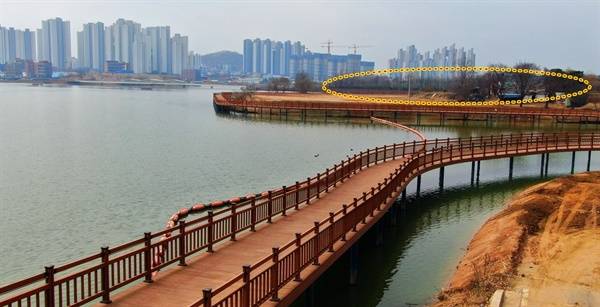 | ▲ 물고기들이 산란하고, 철새들의 보금자리인 저수지 호수가 수면 위에 산책용 데크를 설치했다. |