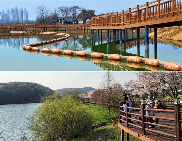 | ▲ 물 위에 산책로를 만들어 생태계를 파괴한 천안시와 물가에 산책로를 만든 수원 광교저수지. 무엇이 옳은 방법일까? |
