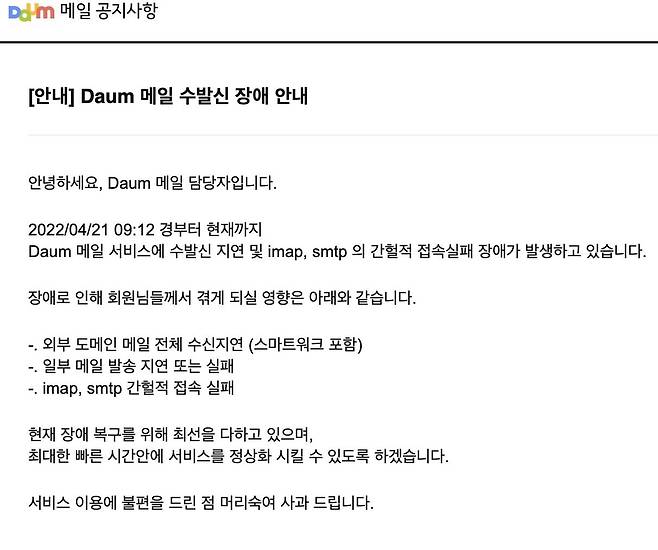 다음은 메일 홈페이지에 공지를 올리고 '외부 도메인 메일 전체 수신 지연', '일부 메일 발송 지연 또는 실패', 'imap·smtp 간헐적 접속 실패' 현상이 나타나고 있다고 밝혔다.