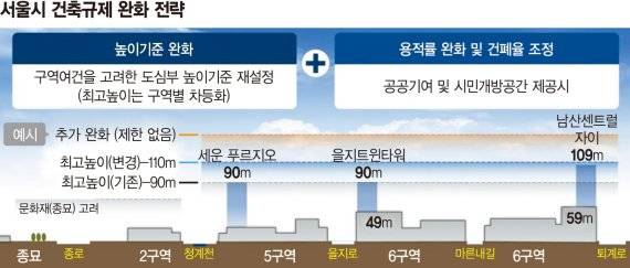 서울시가 대표적인 도심 건축 규제인 높이 제한을 풀어 고밀개발을 허용하고, 이를 통해 기부채납 받은 부지로 녹지공간을 확대하는 도심 재창조에 나선다.