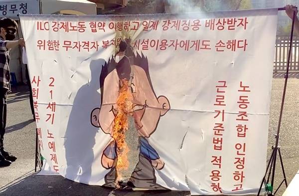 | ▲ 20일, 사회복무요원 노동조합원들이 병무청 앞에서 '굳건이 화형식'을 진행하고 있다. |