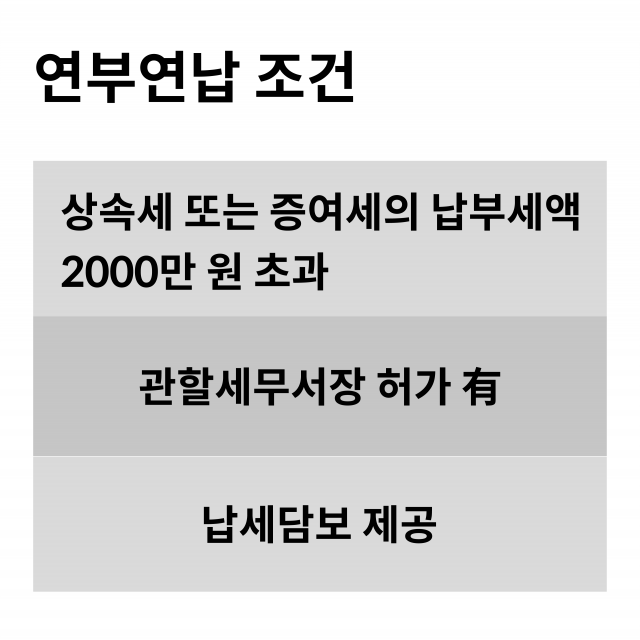 연부연납은 납세자의 일시적 세금 납부에 따른 부담을 덜어주기 위해 세금을 여러 해에 걸쳐 분할해서 납부할 수 있도록 납부 편의를 제공하는 제도를 말한다. 상속세 뿐만 아니라 증여세도 아래의 요건을 모두 충족하면 연부연납이 가능하다. 최근 부동산 가격의 급등으로 부동산에 대한 상속·증여세의 과세 부담이 크게 증가했고 상속재산이나 증여재산의 대부분이 부동산인 경우가 많아서 실제로 상속·증여를 받을 경우 당장 이에 대한 세금을 납부할 수 있는 현금을 마련할 수 없어서 연부연납하는 납세자가 갈수록 증가하고 있다.
