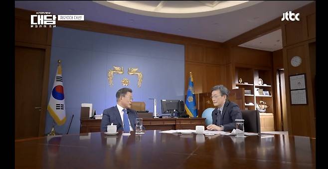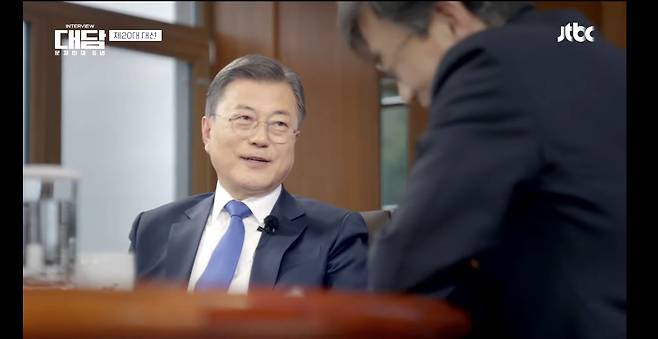 | ▲ 25일 JTBC에 방영된 '대담-문재인의 5년' 1회 중 한 장면. 문재인 대통령이 손석희 JTBC 전 앵커(현 순회특파원)과 인터뷰를 하고 있다. |