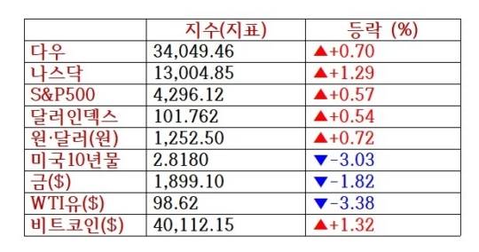 뉴욕증권거래소(NYSE)에서 다우지수는 전 거래일 대비 238.06포인트(0.70%) 상승한 3만4049.46에 마감했다.