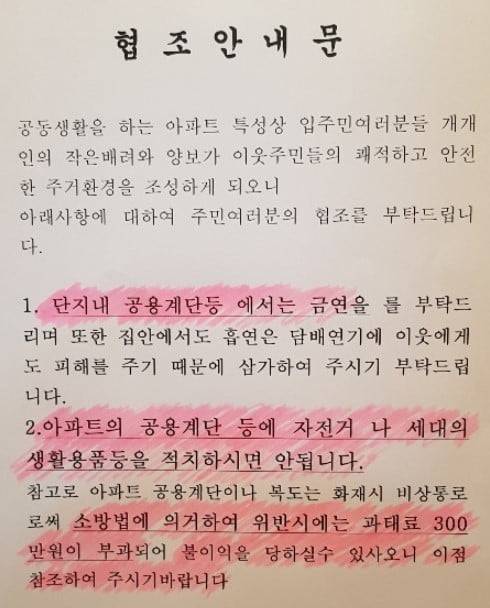 "아파트 복도나 계단은 공용공간입니다. 모두가 쾌적하고 안전한 상황에서 살고 싶은 건 마찬가지인데 혹시라도 대피해야 할 경우 그 물품들로 인해 다칠 수도 있습니다."