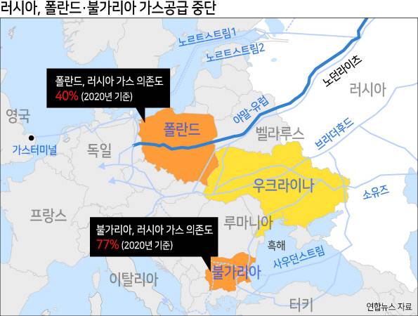 반면, 의존율이 40% 수준인 폴란드는 러시아의 이 같은 조치에 대비한 만큼 영향이 작을 것이라 자신하고 있다. 마테우시 모라비에츠키 폴란드 총리는 이날 “폴란드 가스저장고는 76% 채워진 상태고, 폴란드는 가스공급처 다양화를 위해 준비해왔다”고 말했다.