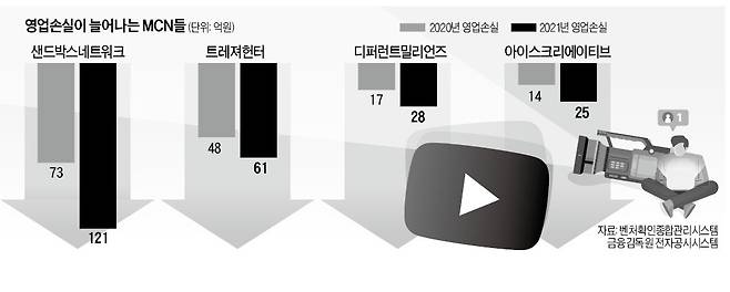 유튜버 등 1인 크리에이터 영향력이 확대되면서 이들의 기획사·소속사 역할을 하는 멀티채널네트워크(MCN) 덩치가 함께 커지고 있다. 하지만 적자 규모도 동시에 눈덩이처럼 증가하고 있다. 손실 증가 속도가 매출 확대 속도보다 오히려 더 빠르다. 새로운 혁신 산업으로 부상하고 있는 ‘크리에이터 이코노미’ 이면에 출혈 경쟁의 부작용이 불거지고 있다는 지적이 나온다.