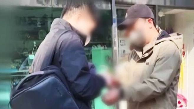 경찰이 모자를 눌러쓴 남성을 길에서 체포합니다.
