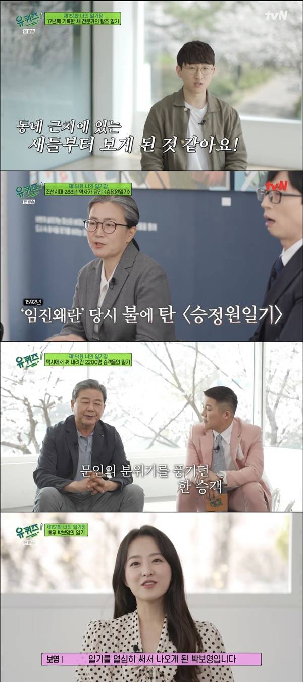 27일 방송된 tvN 예능프로그램 '유 퀴즈 온 더 블럭'(이하 '유퀴즈')에서는 ‘너의 일기장’ 특집으로 꾸며진 가운데 배우 박보영, 새덕후 자기님, 승정원일기 고전번역가, 택시 기사가 출연했다.