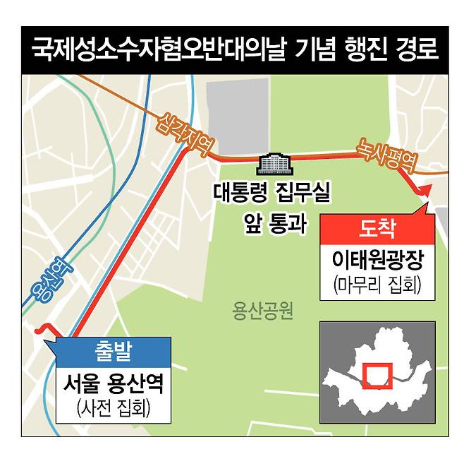 성소수자차별반대 무지개행동은 대통령 집무실 앞을 행진해 통과하는 것을 경찰이 금지하자 지난 25일 소송을 냈다. 국제성소수자혐오반대의날(5월17일)을 맞아 새달 14일 용산역 광장부터 이태원 만남의 광장까지 약 3㎞ 구간을 행진하기로 했는데, 이 중 일부 구간이 대통령 집무실과 100m 이내라는 이유로 경찰이 행진 금지 처분을 내린 것이다.