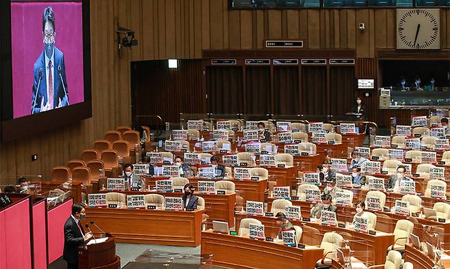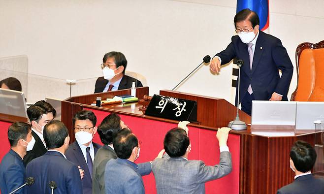 | 국민의힘 본회의 개의 항의 박병석 국회의장(오른쪽)이 27일 ‘검수완박’(검찰 수사권 완전 박탈) 법안 처리를 위한 본회의 개의에 항의하는 국민의힘 의원들에게 자리로 돌아갈 것을 요구하고 있다. 이날 본회의에서는 여야 의원들의 검수완박 찬반 필리버스터(무제한 토론)가 진행됐다. 서상배 선임기자 |