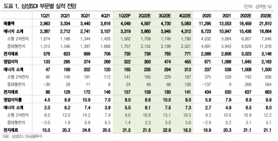삼성SDI는 1분기 매출액으로 4조494억원, 영업이익 3223억원을 기록해 전년동기대비 각각 36.7%, 142% 성장했다. 분기 기준 최대 매출액으로 영업이익은 시장 예상 수준인 2860억원을 10% 웃도는 등 양호한 실적을 보였다.