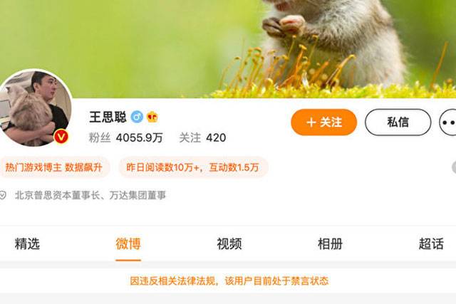 중국의 대표적인 재벌 2세인 완다그룹의 후계자 왕쓰총(34)의 소셜미디어(SNS) 계정이 중국 당국에 의해 차단당했다는 소식이 전해졌다.