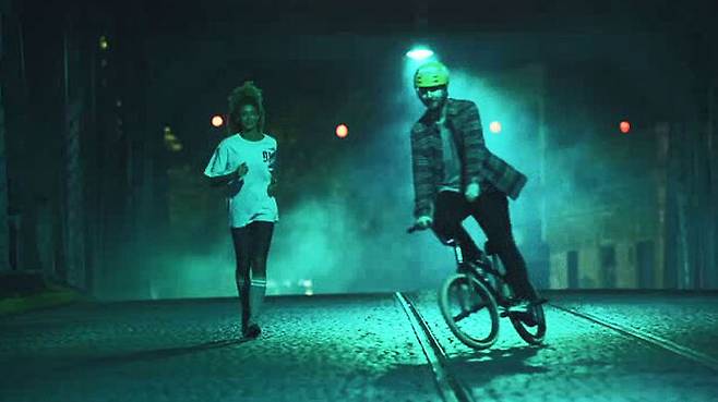 젊은 여성이 홀로 어두운 거리와 골목을 달리는데, 텅 빈 다리에서는 자전거를 탄 남성을 지나치기도 합니다.