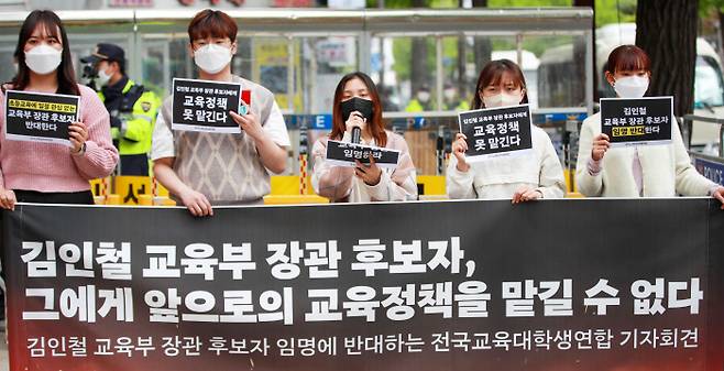 전국교육대학생연합 소속 대학생들이 29일 서울 종로구 통의동 대통령직인수위원회 인근에서 기자회견을 열고 김인철 교육부 장관 후보자 임명에 반대하는 입장을 밝히고 있다.