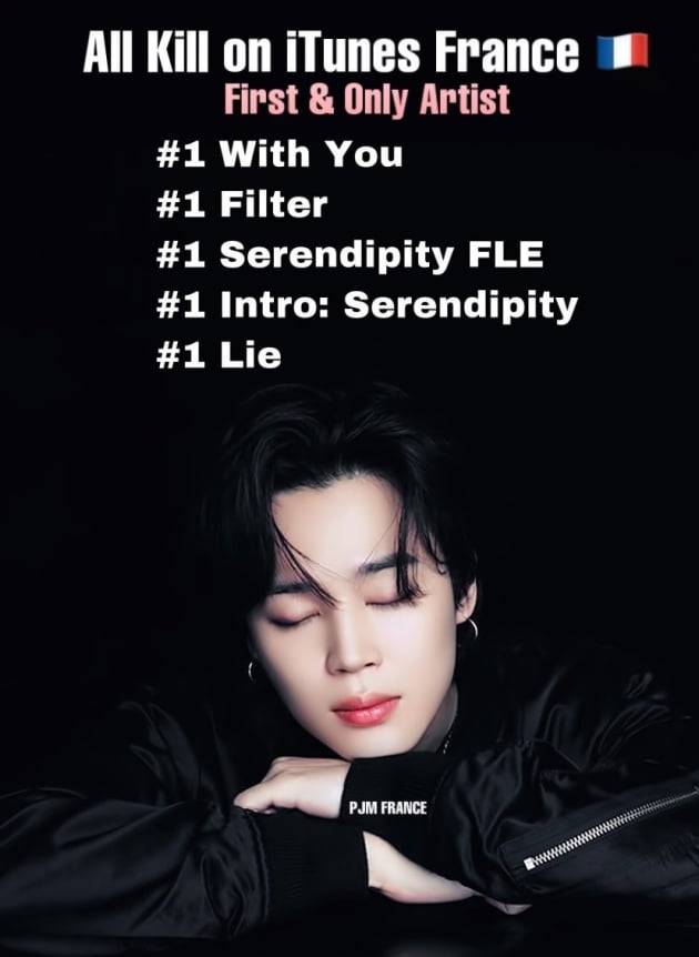 지민은 프랑스 아이튠즈에서 5개 곡이 모두 1위를 차지한 최초이자 유일한 아티스트로 유럽을 강타했다.