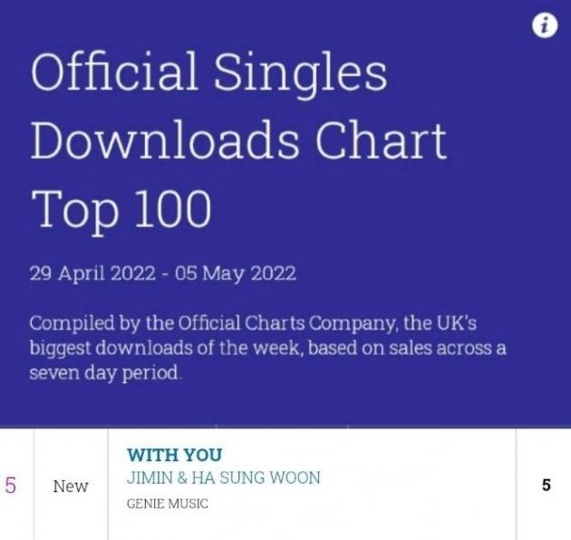 뿐만아니라 영국 오피셜 싱글 다운로드 차트 5위와 싱글 차트 8위로 데뷔한 지민의 'With You'는 뉴질랜드 오피셜 뮤직 차트에서도 13위인 상위에 데뷔하며 전 세계 다양한 음악 차트 점령을 확장해가고 있다.