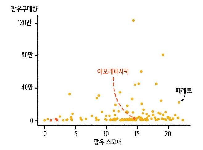 WWF는 전 세계에서 팜유를 사용하는 227개 기업을 대상으로 팜유스코어를 계산해 발표하고 있습니다. 바이어 기업들이 얼마나 지속가능한 팜유를 사용하고 있는지, 얼마나 노력하고 있는지 판단해보겠다는 겁니다. 아래 그래프가 바로 그 팜유스코어를 나타낸 자료입니다. X축이 점수, Y축이 각 기업의 팜유 구매량을 의미합니다. 24점 만점에 평균 점수는 13.2점. 여전히 기업들의 적극적인 기여가 필요한 상황입니다. 20점을 넘는 업체는 단 9곳. 1위는 스위스의 유통사 쿱 스위스였고, 페레로가 21.71점으로 3위를 기록했습니다.