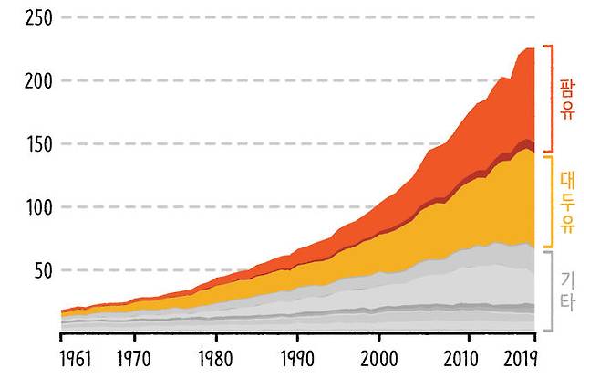 유엔식량농업기구(FAO) 데이터를 보면 2019년 전 세계에서 생산된 식물성 기름은 모두 2억 2,603t입니다. 이 중 팜유(팜핵유 포함)가 36.7%를 차지하고 있죠. 콩기름은 33.6%로 2위를 기록하고 있고요. 사실 국내에서도 가정용으로만 쓰이지 않을 뿐, 콩기름(대두유) 다음으로 많이 생산되는 기름이기도 합니다.