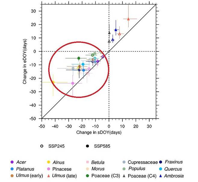 (x축 꽃가루가 날리는 첫 번째 날, y축 꽃가루가 날리는 마지막 날, 그래프 상 빨간 원안에 있다는 건 시작일이 빨라지는 만큼 마지막 날이 빨라지지 않아 전체 기간은 증가한다는 의미이다.)